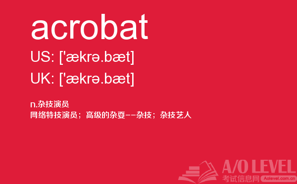 英国a-level入学考试的机会真的很少,每年就5-6月和10-11月两场考试。所以千万别因为不必要的原因,影响了a-level入学考试。为了让大家更好的在英国留学,a/o-level考试网会为大家带来a-level考试相关的资讯,一起来看看a/o-level考试网今天带来的词汇acrobat的解析。如果您想了解alevel可以申请哪里,alevel双语教材,爱德思alevel官网,alevel怎么选课程等关于a-level考试的相关资讯,请继续浏览并关注课窝a/o-level考试网。
