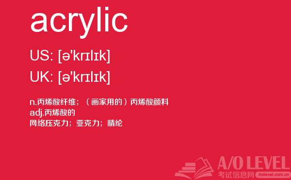 a-level的成绩分为a、b、c、d、e、u六个等级,a为最优,e为通过,u为不及格。如果学生对某门课的成绩不满意,可以选择重考,最终成绩以最好的一次为准。那么a-level考试想要取得a-level高分大家需要做到哪些呢?a/o-level考试网给大家带来的很多a-level考试经验,alevel考试技巧等等,想要考好a-level考试,不仅要知道这些,对于关于a-level考试的所有资讯都需要了解,最重点的是a-level词汇量的积累,今天a/o-level考试网就给大家带来的a-level的考试单词acrylic的全面解析。如果您想了解bc和alevel哪个好,国内知名alevel培训,alevel课程物理,a水准考试要求等关于a-level考试的相关资讯,请继续浏览并关注课窝a/o-level考试网。