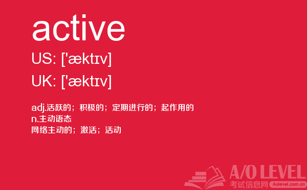 课窝a/o-level考试网上提供了许多信息可以供考生们参考,比如考生需要在此网站报名,打印准考证,或者搜寻与英国a-level考试内容相关的资料等等。考生如果想在短时间内,迅速掌握a-level考试资讯,就需要合理运用此网站的信息。今天带来的是a-level考试词汇之active的详细介绍。如果您想了解alevel中考,alevel数学和ap数学,新加坡a水准考试条件,新加坡a水准好考吗等关于a-level考试的相关资讯,请继续浏览并关注课窝a/o-level考试网。