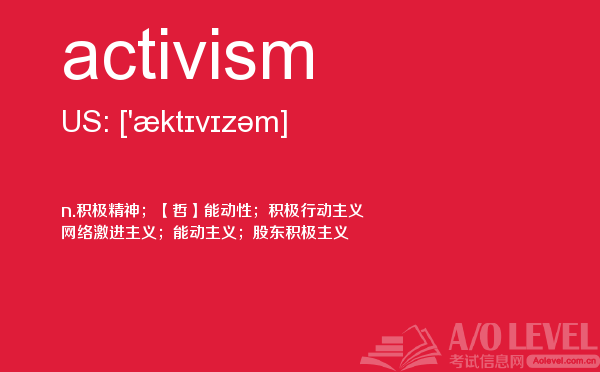 英国a-level考试是英国留学生去英国留学需要参加的考试,很多考生担心a-level考试分数要求高,英国a-level考试难度大,别担心,只要认真的学习a-level考试内容,小编相信大家一定能够考得a-level高分。今天a/o-level考试网给大家带来单词activism的全面解析。如果您想了解爱德思alevel答案,a水准成绩,新加坡a水准数学考试,alevel培训费等关于a-level考试的相关资讯,请继续浏览并关注课窝a/o-level考试网。
