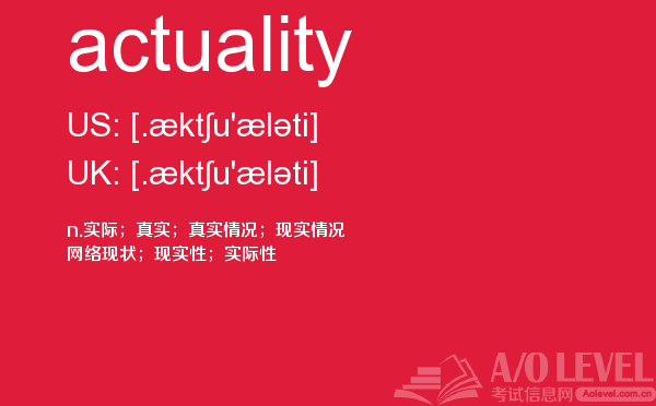 虽然英国a-level院校招生官常把“成绩不是决定录取与否的唯一因素”挂在嘴边,但不得不承认,a-level分数是学生优秀与否的有力证据,取得a-level成绩高分是肯定是优先考虑的。放松一下,先跟着a/o-level考试网来看看今天小编带来的是a-level单词actuality的介绍。如果您想了解alevel培训价格,新加坡alevel,alevel化学提纲,alevel国际高中课程等关于a-level考试的相关资讯,请继续浏览并关注课窝a/o-level考试网。