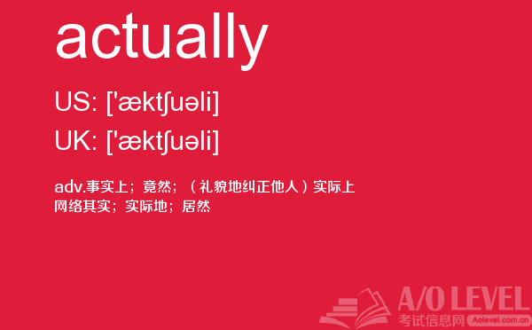 现在申请英国院校的中国孩子非常多,几乎每一个学生都在为一种叫做英国a-level的考试而努力着。a/o-level考试网老师为大家解析a-level考试重难点单词actually,大家认真学习,会有帮助。如果您想了解alevel经济真题及答案,alevel好考吗,英国alevel考试试卷,新加坡alevel考试几月等关于a-level考试的相关资讯,请继续浏览并关注课窝a/o-level考试网。