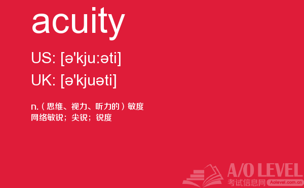 在a-level备考的过程中,想要冲刺到a-level写作的高分,相信大家都应该会知道,除了需要掌握a-level写作的一些技巧之外,优化文章中的词汇和句型也是冲刺高分的关键所在。也就是说,只有充分掌握了语法知识,才能让我们的的文章更为丰富形象。除了a-level写作,在a-level其他方面同学们也需要了解,下面课窝a/o-level考试网小编给大家带来a-level单词acuity的介绍。如果您想了解一年读完alevel,alevel数学和ap数学,alevel成绩网上查询,alevel考试网上报名等关于a-level考试的相关资讯,请继续浏览并关注课窝a/o-level考试网。