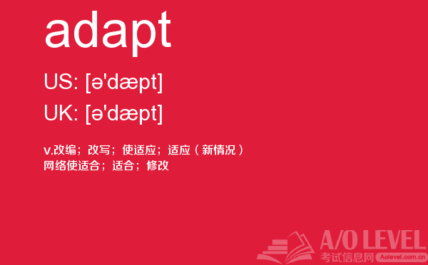 英国a-level学校,从教学质量上来看私立学校更占优势,大部分中国留学生也选择私立学校来读,不过一般都是提前一年来申请学校。中国目前也有20几所a-level学校,每年也同样有走进剑桥牛津等世界顶级大学的学生。所以在国外和在国内都可以选择a-level学校来学习。在前面关于a-level选校的问题已经详细介绍过,那么今天a/o-level考试网小编主要想介绍的是a-level重难点词汇adapt。希望对大家有帮助。如果您想了解alevel写作真题,alevel写作分数,新加坡a水准报名费,新alevel等关于a-level考试的相关资讯,请继续浏览并关注课窝a/o-level考试网。