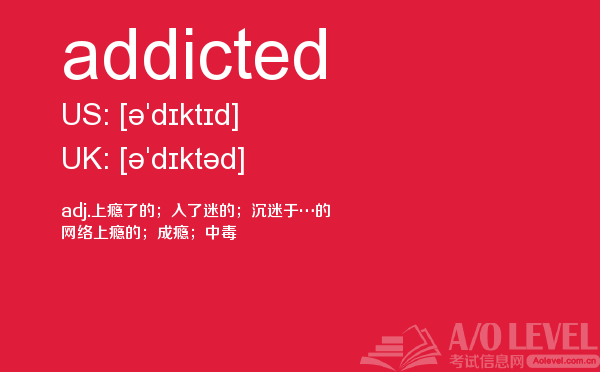 英国的大多数中学开设的alevel课程科目相当广泛,有文科、商科、经济、语言、数学、理科、计算、法律、媒体、音乐等。学生的alevel考试成绩及其所选修的a-level课程在很大程度上决定着能否进入理想的大学和学习所选择的学位课程。关于alevel考试alevel考试网会给大家带来和a-level考试相关的资讯,下面带来的是单词addicted的介绍,会对大家的a-level考试成绩有帮助。如果您想了解上海alevel课程,美国大学alevel,alevel高二全球统考时间,alevel入学要求等关于a-level考试的相关资讯,请继续浏览并关注课窝a/o-level考试网。