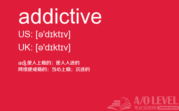 众多周知的英国a-level入学考试是进入英国院校的必经之路,所以我们自然不能小看,建议同学们能够加强a-level考试真题的练习,提前明确英国a-level考试报名的具体信息。为了提高考生们的英国a-level考试成绩,a/o-level考试网小编会每天给大家更新a-level留学资讯和alevel考试资讯,今天带来的是关于a-level考试词汇的单词全解,下面带你学习addictive的用法。如果您想了解alevel考什么,alevel水平考试,alevel数学包括什么,英国中学排名alevel等关于a-level考试的相关资讯,请继续浏览并关注课窝a/o-level考试网。