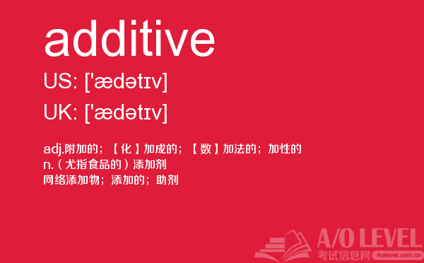 a-level课程证书被几乎所有英语授课的大学作为招收新生的入学标准。 在中国开设a-level课程旨在为中国学生提供进入国外大学的有效途径,具体目标为:培养在国内初高中成绩优秀的学生进入世界顶尖大学;培养在国内初高中成绩中等的学生进入世界一流大学;培养在国内初高中成绩一般的学生考取适合自己的大学。今天alevel考试网小编给大家详细解析a-level考试单词additive。如果您想了解alevel物理知识点,a水准物理专业术语,a水准考试试题,中国alevel考试等关于a-level考试的相关资讯,请继续浏览并关注课窝a/o-level考试网。