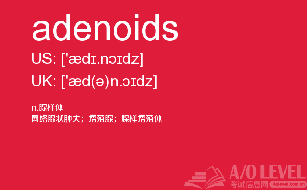 众多周知的英国a-level入学考试是进入英国院校的必经之路,所以我们自然不能小看,建议同学们能够加强a-level考试真题的练习,提前明确英国a-level考试报名的具体信息。为了提高考生们的英国a-level考试成绩,a/o-level考试网小编会每天给大家更新a-level留学资讯和alevel考试资讯,今天带来的是关于a-level考试词汇的单词全解,下面带你学习adenoids的用法。如果您想了解alevel是什么,alevel考试官方网站,英国alevel教材,英国alevel学校等关于a-level考试的相关资讯,请继续浏览并关注课窝a/o-level考试网。