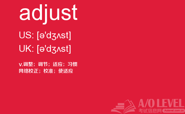 英国的大多数中学开设的alevel课程科目相当广泛,有文科、商科、经济、语言、数学、理科、计算、法律、媒体、音乐等。学生的alevel考试成绩及其所选修的a-level课程在很大程度上决定着能否进入理想的大学和学习所选择的学位课程。关于alevel考试alevel考试网会给大家带来和a-level考试相关的资讯,下面带来的是单词adjust的介绍,会对大家的a-level考试成绩有帮助。如果您想了解上海alevel培训班,上海alevel培训机构,新加坡a水准考试时间,新加坡大使馆a水准考试等关于a-level考试的相关资讯,请继续浏览并关注课窝a/o-level考试网。