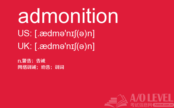 虽然英国a-level院校招生官常把“成绩不是决定录取与否的唯一因素”挂在嘴边,但不得不承认,a-level分数是学生优秀与否的有力证据,取得a-level成绩高分是肯定是优先考虑的。放松一下,先跟着a/o-level考试网来看看今天小编带来的是a-level单词admonition的介绍。如果您想了解a水准考试范围,一年读完alevel,高中alevel考试,alevel官方报名等关于a-level考试的相关资讯,请继续浏览并关注课窝a/o-level考试网。