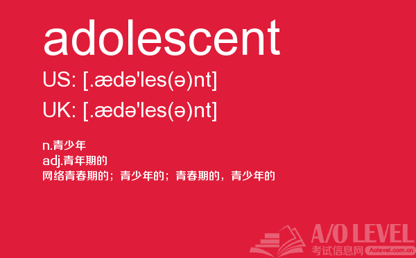 英国a-level入学考试的机会真的很少,每年就5-6月和10-11月两场考试。所以千万别因为不必要的原因,影响了a-level入学考试。为了让大家更好的在英国留学,a/o-level考试网会为大家带来a-level考试相关的资讯,一起来看看a/o-level考试网今天带来的词汇adolescent的解析。如果您想了解澳大利亚alevel,alevel物理难吗,在线alevel培训,alevel报名网站等关于a-level考试的相关资讯,请继续浏览并关注课窝a/o-level考试网。