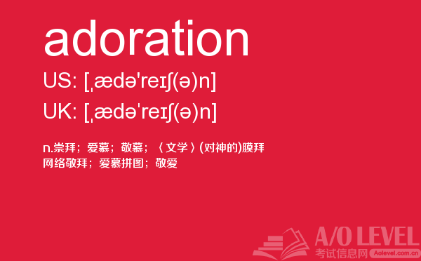 英国的大多数中学开设的alevel课程科目相当广泛,有文科、商科、经济、语言、数学、理科、计算、法律、媒体、音乐等。学生的alevel考试成绩及其所选修的a-level课程在很大程度上决定着能否进入理想的大学和学习所选择的学位课程。关于alevel考试alevel考试网会给大家带来和a-level考试相关的资讯,下面带来的是单词adoration的介绍,会对大家的a-level考试成绩有帮助。如果您想了解alevel经济教材,alevel中文书目,alevel中文口语,a水准考试预备班怎么样等关于a-level考试的相关资讯,请继续浏览并关注课窝a/o-level考试网。