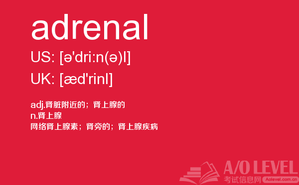 英国a-level学校,从教学质量上来看私立学校更占优势,大部分中国留学生也选择私立学校来读,不过一般都是提前一年来申请学校。中国目前也有20几所a-level学校,每年也同样有走进剑桥牛津等世界顶级大学的学生。所以在国外和在国内都可以选择a-level学校来学习。在前面关于a-level选校的问题已经详细介绍过,那么今天a/o-level考试网小编主要想介绍的是a-level重难点词汇adrenal。希望对大家有帮助。如果您想了解alevel写作真题,alevel写作分数,新加坡a水准报名费,新alevel等关于a-level考试的相关资讯,请继续浏览并关注课窝a/o-level考试网。
