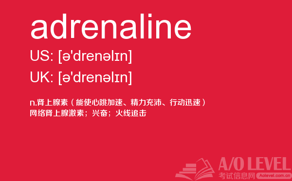 随着英国留学申请竞争的白热化,a-level成绩在学生个人简历中扮演的“入场券”角色,变得越来越重要。然而,在你参加a-level考试培训班前,你首先要对a-level考试有着一定的了解,一起跟着a/o-level考试网来看看小编今天带来a-level单词adrenaline的详细介绍。如果您想了解alevel入学考试,alevel网校,alevel中文,alevel物理专业术语等关于a-level考试的相关资讯,请继续浏览并关注课窝a/o-level考试网。