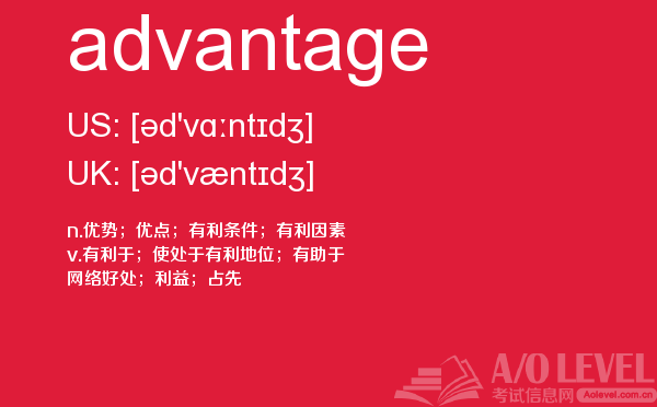 目前,a/olevel逐渐为人所熟知,很多学生都会主动了解alevel考试流程。同时也会抱怨a-level英语题比较难,任务重。那现在我们就放松一下,跟着a/o-level考试网小编来看看a-level考试中要积累的单词advantage,认真的学习积累。如果您想了解alevel非全日制培训,新加坡a水准好考吗,爱德思alevel中国官网,爱德斯alevel等关于a-level考试的相关资讯,请继续浏览并关注课窝a/o-level考试网。