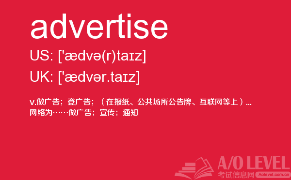 在a-level备考的过程中,想要冲刺到a-level写作的高分,相信大家都应该会知道,除了需要掌握a-level写作的一些技巧之外,优化文章中的词汇和句型也是冲刺高分的关键所在。也就是说,只有充分掌握了语法知识,才能让我们的的文章更为丰富形象。除了a-level写作,在a-level其他方面同学们也需要了解,下面课窝a/o-level考试网小编给大家带来a-level单词advertise的介绍。如果您想了解什么是a水准考试,alevel能不能代替sat,南京alevel,alevel数学公式等关于a-level考试的相关资讯,请继续浏览并关注课窝a/o-level考试网。