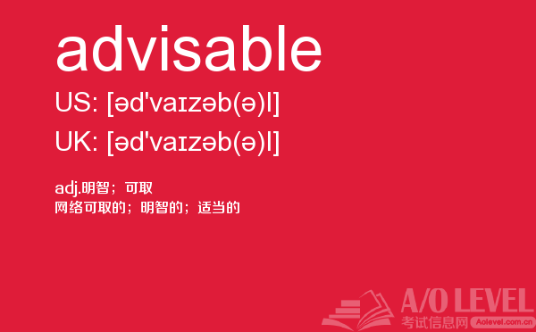 a-level课程证书被几乎所有英语授课的大学作为招收新生的入学标准。 在中国开设a-level课程旨在为中国学生提供进入国外大学的有效途径,具体目标为:培养在国内初高中成绩优秀的学生进入世界顶尖大学;培养在国内初高中成绩中等的学生进入世界一流大学;培养在国内初高中成绩一般的学生考取适合自己的大学。今天alevel考试网小编给大家详细解析a-level考试单词advisable。如果您想了解alevel经济学真题,a水准认可英联邦国家,查询alevel考试报名信息2018,alevel数学怎么选等关于a-level考试的相关资讯,请继续浏览并关注课窝a/o-level考试网。