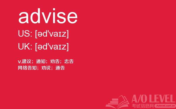a-level课程适用于年龄在15—18之间,初中毕业以上的在校中学生或具有同等学历的职高生,通常国内a-level学校招收的是高二毕业的学生,并要求参加相关的入学考试,由于a-level课程包括教学及试卷习题等都是英文形式出现,所以这要求学生有较高的英文水平。对于a-level考试适用对象有初步了解之后,下面alevel考试网给大家带来的alevel考试中你需要重点记住的单词advise的详细介绍。如果您想了解考alevel有年龄限制吗,alevel课程难吗,新加坡最好的a水准预科学校,上海alevel辅导等关于a-level考试的相关资讯,请继续浏览并关注课窝a/o-level考试网。
