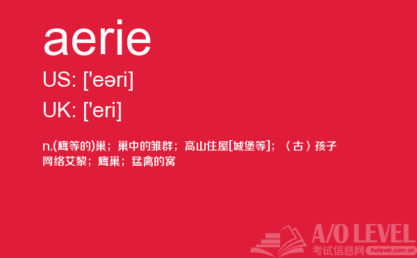 a-level课程适用于年龄在15—18之间,初中毕业以上的在校中学生或具有同等学历的职高生,通常国内a-level学校招收的是高二毕业的学生,并要求参加相关的入学考试,由于a-level课程包括教学及试卷习题等都是英文形式出现,所以这要求学生有较高的英文水平。对于a-level考试适用对象有初步了解之后,下面alevel考试网给大家带来的alevel考试中你需要重点记住的单词aerie的详细介绍。如果您想了解alevel化学难不难,alevel生物,香港中文大学alevel,alevel报名流程等关于a-level考试的相关资讯,请继续浏览并关注课窝a/o-level考试网。