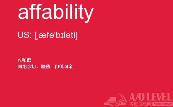 目前,a/olevel逐渐为人所熟知,很多学生都会主动了解alevel考试流程。同时也会抱怨a-level英语题比较难,任务重。那现在我们就放松一下,跟着a/o-level考试网小编来看看a-level考试中要积累的单词affability,认真的学习积累。如果您想了解alevel物理真题,如何成为alevel老师,英国读alevel,为什么要考alevel课程等关于a-level考试的相关资讯,请继续浏览并关注课窝a/o-level考试网。