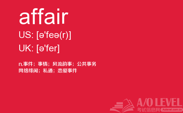 a-level词汇量受到的关注越来越高,很多家长担心a-level考试培训费用,a-level考试录取竞争会不会越来越激烈?这些问题在课窝a/o-level考试网小编都会给大家带来详细介绍,今天a/o-level考试网小编给大家带来的是在a-level考试中的重点词汇affair的详细介绍。如果您想了解alevel怎么自学,a水准数学,alevel考试指南,alevel自学选什么等关于a-level考试的相关资讯,请继续浏览并关注课窝a/o-level考试网。