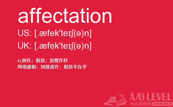 a-level(general certificate of education advanced level ),英国高中课程,是英国全民课程体系,是英国普通中等教育证书考试高级水平课程,也是英国学生的大学入学考试课程。今天alevel考试网小编给大家带来的alevel考试单词affectation的详细介绍。希望大家能够认真的阅读。如果您想了解alevel经济知识点,英国读alevel,alevel化学实验,新加坡alevel考试时间等关于a-level考试的相关资讯,请继续浏览并关注课窝a/o-level考试网。
