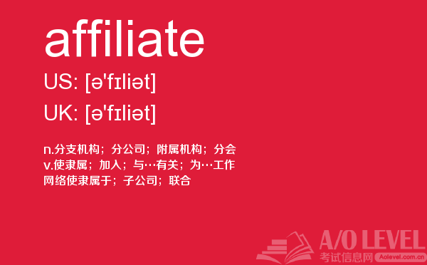 在a-level备考的过程中,想要冲刺到a-level写作的高分,相信大家都应该会知道,除了需要掌握a-level写作的一些技巧之外,优化文章中的词汇和句型也是冲刺高分的关键所在。也就是说,只有充分掌握了语法知识,才能让我们的的文章更为丰富形象。除了a-level写作,在a-level其他方面同学们也需要了解,下面课窝a/o-level考试网小编给大家带来a-level单词affiliate的介绍。如果您想了解一年读完alevel,alevel数学和ap数学,alevel成绩网上查询,alevel考试网上报名等关于a-level考试的相关资讯,请继续浏览并关注课窝a/o-level考试网。