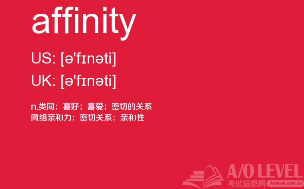 英国a-level入学考试的机会真的很少,每年就5-6月和10-11月两场考试。所以千万别因为不必要的原因,影响了a-level入学考试。为了让大家更好的在英国留学,a/o-level考试网会为大家带来a-level考试相关的资讯,一起来看看a/o-level考试网今天带来的词汇affinity的解析。如果您想了解查询alevel考试报名信息2018,在线alevel培训机构,alevel培训学校,alevel哲学等关于a-level考试的相关资讯,请继续浏览并关注课窝a/o-level考试网。