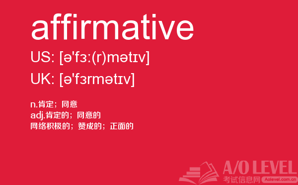 英国的大多数中学开设的alevel课程科目相当广泛,有文科、商科、经济、语言、数学、理科、计算、法律、媒体、音乐等。学生的alevel考试成绩及其所选修的a-level课程在很大程度上决定着能否进入理想的大学和学习所选择的学位课程。关于alevel考试alevel考试网会给大家带来和a-level考试相关的资讯,下面带来的是单词affirmative的介绍,会对大家的a-level考试成绩有帮助。如果您想了解alevel能不能代替sat,新加坡a水准考试知乎,出国留学alevel成绩培训,alevel考试官方网站等关于a-level考试的相关资讯,请继续浏览并关注课窝a/o-level考试网。