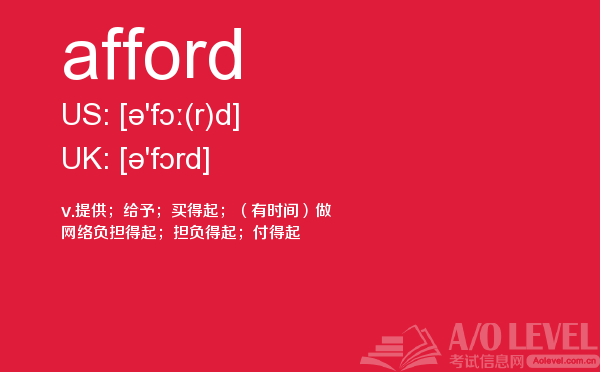 a-level课程证书被几乎所有英语授课的大学作为招收新生的入学标准。 在中国开设a-level课程旨在为中国学生提供进入国外大学的有效途径,具体目标为:培养在国内初高中成绩优秀的学生进入世界顶尖大学;培养在国内初高中成绩中等的学生进入世界一流大学;培养在国内初高中成绩一般的学生考取适合自己的大学。今天alevel考试网小编给大家详细解析a-level考试单词afford。如果您想了解alevel考试形式,新加坡a水准化学考试,alevel难不难,alevel数学公式等关于a-level考试的相关资讯,请继续浏览并关注课窝a/o-level考试网。