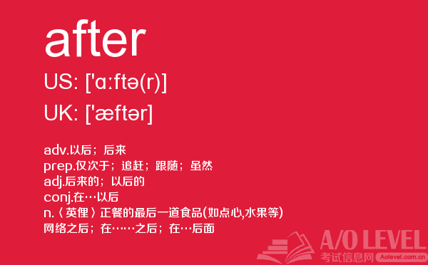 英国a-level考试报名费很好解决,那怎样才能达到a-level考试词汇量要求呢?别再纠结于a-level考试分数要求了,今天我们来一起看看a/o-level考试网今天带给你的a-level单词after的讲解。如果您想了解英国大学alevel要求,alevel考试指南,新加坡最好的a水准预科学校,alevel化学教材电子版等关于a-level考试的相关资讯,请继续浏览并关注课窝a/o-level考试网。