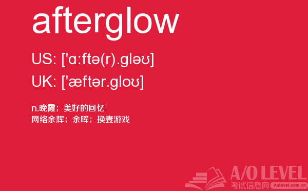 英国的大多数中学开设的alevel课程科目相当广泛,有文科、商科、经济、语言、数学、理科、计算、法律、媒体、音乐等。学生的alevel考试成绩及其所选修的a-level课程在很大程度上决定着能否进入理想的大学和学习所选择的学位课程。关于alevel考试alevel考试网会给大家带来和a-level考试相关的资讯,下面带来的是单词afterglow的介绍,会对大家的a-level考试成绩有帮助。如果您想了解alevel排名,alevel培训价格,alevel数学公式表,alevel奖学金等关于a-level考试的相关资讯,请继续浏览并关注课窝a/o-level考试网。