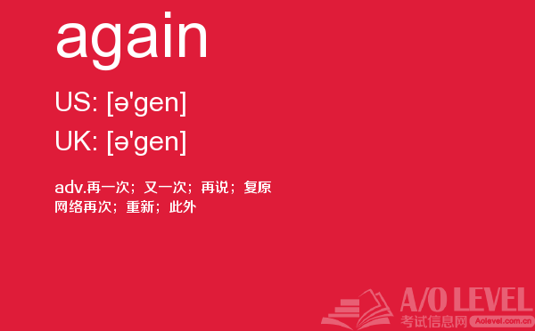 英国a-level考试报名费很好解决,那怎样才能达到a-level考试词汇量要求呢?别再纠结于a-level考试分数要求了,今天我们来一起看看a/o-level考试网今天带给你的a-level单词again的讲解。如果您想了解alevel考试登记,南京alevel培训,alevel课程如何升大学,alevel是什么等关于a-level考试的相关资讯,请继续浏览并关注课窝a/o-level考试网。