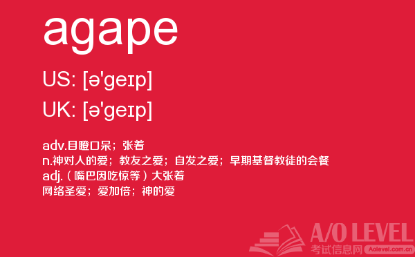 英国a-level入学考试的机会真的很少,每年就5-6月和10-11月两场考试。所以千万别因为不必要的原因,影响了a-level入学考试。为了让大家更好的在英国留学,a/o-level考试网会为大家带来a-level考试相关的资讯,一起来看看a/o-level考试网今天带来的词汇agape的解析。如果您想了解alevel生物难度,英国alevel排名,alevel考试考点,申请英国alevel高中等关于a-level考试的相关资讯,请继续浏览并关注课窝a/o-level考试网。