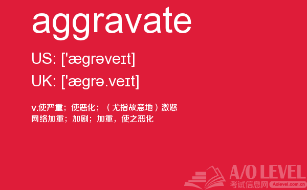 英国a-level学校,从教学质量上来看私立学校更占优势,大部分中国留学生也选择私立学校来读,不过一般都是提前一年来申请学校。中国目前也有20几所a-level学校,每年也同样有走进剑桥牛津等世界顶级大学的学生。所以在国外和在国内都可以选择a-level学校来学习。在前面关于a-level选校的问题已经详细介绍过,那么今天a/o-level考试网小编主要想介绍的是a-level重难点词汇aggravate。希望对大家有帮助。如果您想了解上海alevel培训机构,alevel数学公式表,alevel成绩查询时间,alevel申请新加坡等关于a-level考试的相关资讯,请继续浏览并关注课窝a/o-level考试网。