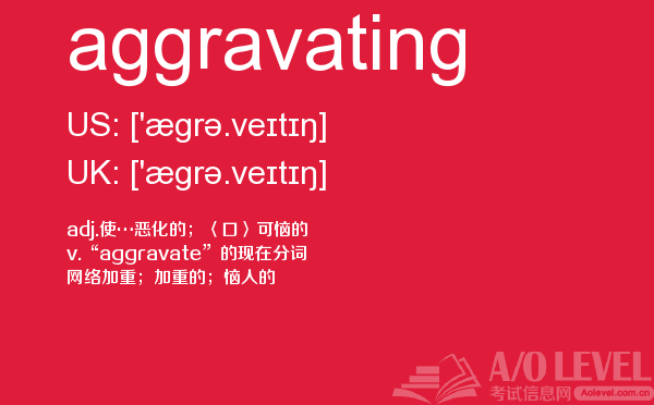 英国以其高质量的教学闻名于世,如果你还在思考a-level考试值不值得考?近几年的英国留学a-level考试的热潮足以证明一切!课窝a/o-level考试网会给大家带来a-level考试真题,a-level考试如何复习?等所有有关的a-level考试资讯。课窝a/o-level考试网今天带来a-level考试中很重要的单词aggravating的详细解析,会对你有帮助。如果您想了解alevel证书,爱德思alevel真题,alevel经济2017试卷,新加坡alevel等关于a-level考试的相关资讯,请继续浏览并关注课窝a/o-level考试网。