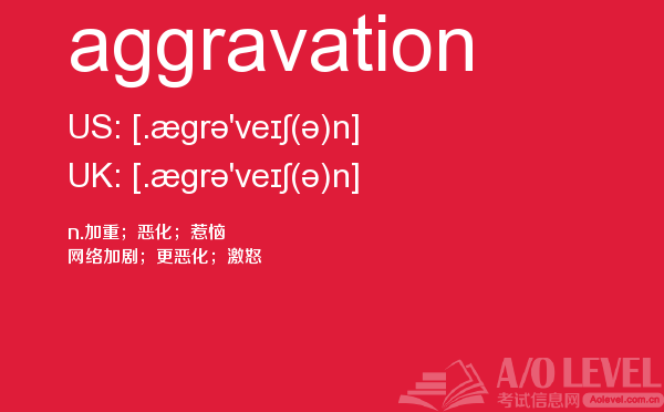英国留学考试a-level考试考什么?a-level考试题型一定要注意积累和总结。课窝a/o-level考试网小编每天会给大家带来a-level考试的相关资讯,今天带来a-level单词aggravation的解析,希望大家认真的积累a-level考试词汇。如果您想了解爱德思alevel答案,alevel英语词汇,alevel物理,alevel考试报名网站等关于a-level考试的相关资讯,请继续浏览并关注课窝a/o-level考试网。