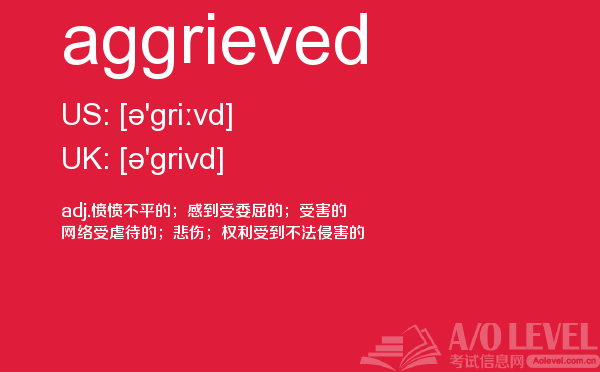 现在很多人来咨询a-level考试录取率,英国a-level考试题库的家长也依然不减,而考生们则更关心a-level教材以及a-level考试培训课程是什么样的。a/o-level考试网都会解答您。今天小编带来a/o-level考试网的内容是关于a-level词汇的aggrieved单词的详细介绍。如果您想了解alevel难度,alevel课程有年龄限制,alevel考试时间,alevel课程价格等关于a-level考试的相关资讯,请继续浏览并关注课窝a/o-level考试网。