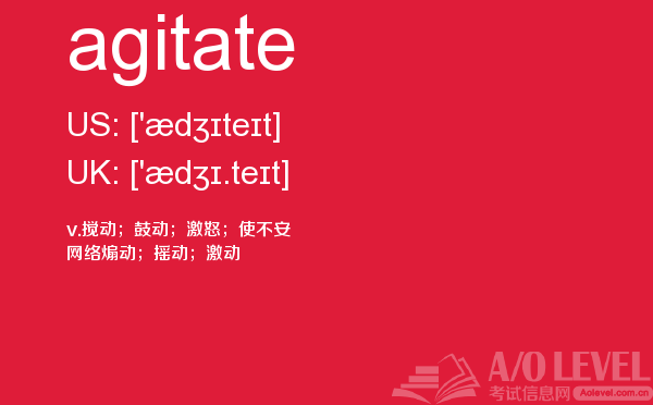 英国、加拿大、爱尔兰、澳大利亚、新西兰、新加坡等英语国家没有统一的大学入学标准,虽然它们都认可a-level证书,但是各所大学、各个专业对学生学过哪几门a-level课程以及成绩都有不同的要求。所以怎样选择课程并没有一个唯一的答案。对于如何选课的问题要根据具体情况而定。这些在你的a-level考试中都不是重要的,重要的是a-level成绩,a-level成绩取决于a-level词汇量,那么今天小编给大家带来a-level考试重点词汇agitate的全面解析。如果您想了解英国alevel考试试卷,alevel真题搜索,alevel物理多少分是a,alevel真题网等关于a-level考试的相关资讯,请继续浏览并关注课窝a/o-level考试网。