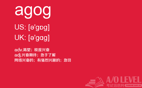 就读于国内学校的学生, 在申请英国学校时需要提交英国a-level考试成绩。很多考生因此英国a-level考试搞得头疼,放松一下,跟着a/o-level考试网来看看英国留学资讯吧!今天课窝a/o-level考试网小编给大家带来a-level考试重点词汇agog的全解,对你肯定有帮助。如果您想了解剑桥alevel课程费用,alevel物理as简答题,alevel考试难度,了解alevel培训等关于a-level考试的相关资讯,请继续浏览并关注课窝a/o-level考试网。