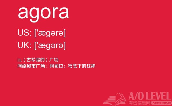 英国a-level学校,从教学质量上来看私立学校更占优势,大部分中国留学生也选择私立学校来读,不过一般都是提前一年来申请学校。中国目前也有20几所a-level学校,每年也同样有走进剑桥牛津等世界顶级大学的学生。所以在国外和在国内都可以选择a-level学校来学习。在前面关于a-level选校的问题已经详细介绍过,那么今天a/o-level考试网小编主要想介绍的是a-level重难点词汇agora。希望对大家有帮助。如果您想了解alevel官方报名,alevel美术课程,alevel数学难度,alevel高数等关于a-level考试的相关资讯,请继续浏览并关注课窝a/o-level考试网。