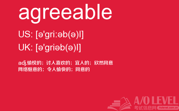 今天课窝a/o-level考试网小编给大家带来alevel考试至关重要的内容a-level单词agreeable的详细介绍。希望大家能够认真的阅读,在备考a-level中会用到,关于a-level考试时间,alevel考试费用等相关问题,可以关注课窝a/o-level考试网。如果您想了解alevel难度,alevel课程有年龄限制,alevel考试时间,alevel课程价格等关于a-level考试的相关资讯,请继续浏览并关注课窝a/o-level考试网。