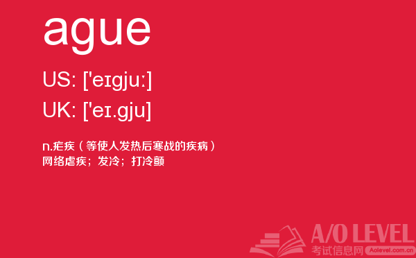 英国、加拿大、爱尔兰、澳大利亚、新西兰、新加坡等英语国家没有统一的大学入学标准,虽然它们都认可a-level证书,但是各所大学、各个专业对学生学过哪几门a-level课程以及成绩都有不同的要求。所以怎样选择课程并没有一个唯一的答案。对于如何选课的问题要根据具体情况而定。这些在你的a-level考试中都不是重要的,重要的是a-level成绩,a-level成绩取决于a-level词汇量,那么今天小编给大家带来a-level考试重点词汇ague的全面解析。如果您想了解alevel数学评分,alevel作文,新加坡读a水准,alevel成绩网上查询等关于a-level考试的相关资讯,请继续浏览并关注课窝a/o-level考试网。