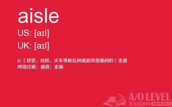 英国a-level入学考试的机会真的很少,每年就5-6月和10-11月两场考试。所以千万别因为不必要的原因,影响了a-level入学考试。为了让大家更好的在英国留学,a/o-level考试网会为大家带来a-level考试相关的资讯,一起来看看a/o-level考试网今天带来的词汇aisle的解析。如果您想了解新加坡alevel考试时间,新加坡a水准数学考试,南京alevel中心,上海alevel培训班等关于a-level考试的相关资讯,请继续浏览并关注课窝a/o-level考试网。