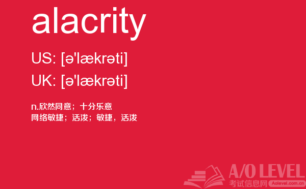 在a-level备考的过程中,想要冲刺到a-level写作的高分,相信大家都应该会知道,除了需要掌握a-level写作的一些技巧之外,优化文章中的词汇和句型也是冲刺高分的关键所在。也就是说,只有充分掌握了语法知识,才能让我们的的文章更为丰富形象。除了a-level写作,在a-level其他方面同学们也需要了解,下面课窝a/o-level考试网小编给大家带来a-level单词alacrity的介绍。如果您想了解alevel经济学大纲,英国高中alevel排名,alevel试卷,用alevel成绩申请大学等关于a-level考试的相关资讯,请继续浏览并关注课窝a/o-level考试网。