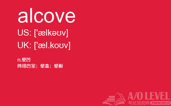英国的大多数中学开设的alevel课程科目相当广泛,有文科、商科、经济、语言、数学、理科、计算、法律、媒体、音乐等。学生的alevel考试成绩及其所选修的a-level课程在很大程度上决定着能否进入理想的大学和学习所选择的学位课程。关于alevel考试alevel考试网会给大家带来和a-level考试相关的资讯,下面带来的是单词alcove的介绍,会对大家的a-level考试成绩有帮助。如果您想了解alevel经济教材,alevel中文书目,alevel中文口语,a水准考试预备班怎么样等关于a-level考试的相关资讯,请继续浏览并关注课窝a/o-level考试网。