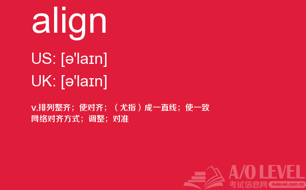 a-level(general certificate of education advanced level ),英国高中课程,是英国全民课程体系,是英国普通中等教育证书考试高级水平课程,也是英国学生的大学入学考试课程。今天alevel考试网小编给大家带来的alevel考试单词align的详细介绍。希望大家能够认真的阅读。如果您想了解港大alevel申请条件,alevel中国大学,alevel成绩申请港大,alevel经济教材电子版等关于a-level考试的相关资讯,请继续浏览并关注课窝a/o-level考试网。