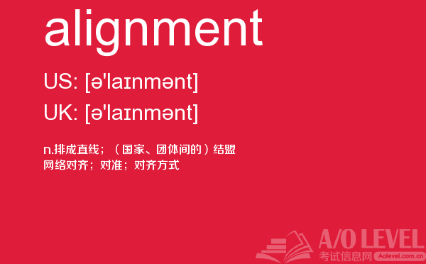 英国高中课程(a-level)的学制为两年:第一年称为as水准,学生通常选择自己最擅长且最有兴趣的3—4门课,通过考试后获得as证书。第二年称为a2水准,学生可选择as水准中优秀的3门课继续学习,通过考试后获得a-level证书。关于a-level学制相信大家肯定有一定的了解,今天alevel考试网想要带大家了解的并不是a-level学制的问题,想要介绍的是a-level重难点单词alignment,希望对大家有帮助。如果您想了解为什么要考alevel课程,上海alevel国际学校,国际学校alevel宣传片,化学alevel2018等关于a-level考试的相关资讯,请继续浏览并关注课窝a/o-level考试网。