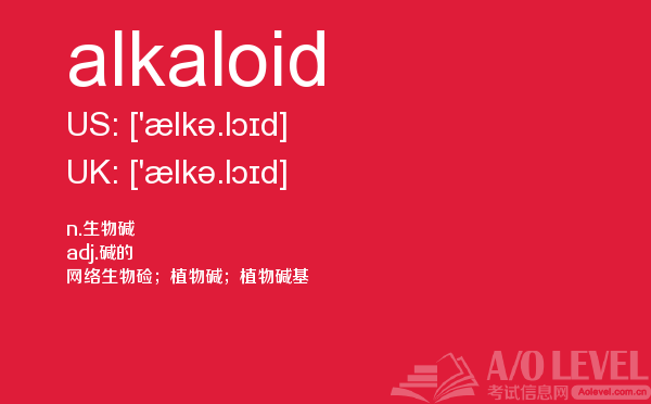 目前,a/olevel逐渐为人所熟知,很多学生都会主动了解alevel考试流程。同时也会抱怨a-level英语题比较难,任务重。那现在我们就放松一下,跟着a/o-level考试网小编来看看a-level考试中要积累的单词alkaloid,认真的学习积累。如果您想了解alevel考场地址,alevel中文考试真题,alevel物理常备词汇,alevel辅导等关于a-level考试的相关资讯,请继续浏览并关注课窝a/o-level考试网。