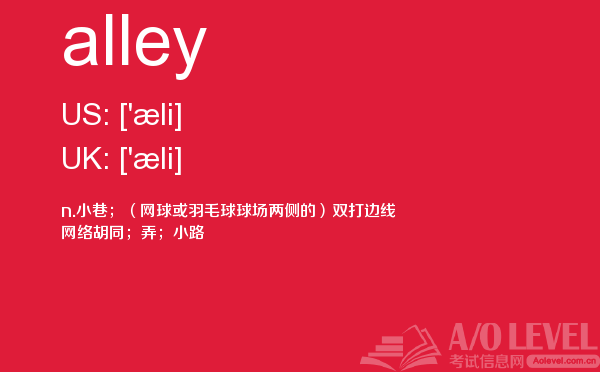 英国高中课程(a-level)的学制为两年:第一年称为as水准,学生通常选择自己最擅长且最有兴趣的3—4门课,通过考试后获得as证书。第二年称为a2水准,学生可选择as水准中优秀的3门课继续学习,通过考试后获得a-level证书。关于a-level学制相信大家肯定有一定的了解,今天alevel考试网想要带大家了解的并不是a-level学制的问题,想要介绍的是a-level重难点单词alley,希望对大家有帮助。如果您想了解alevel经济essay,alevel成绩有效期,alevel进阶数学分数段,什么是alevel课程等关于a-level考试的相关资讯,请继续浏览并关注课窝a/o-level考试网。